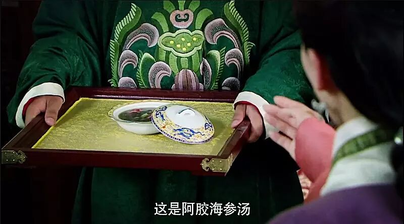 除了橘紅沉香蒸肉丸,允賢還烹製了阿膠海參湯。關於阿膠,在劇中已經不是第一次出現了,第10集中允賢妹子給朱祁鈺母妃開藥方時,也建議太妃可多食一些阿膠進補。