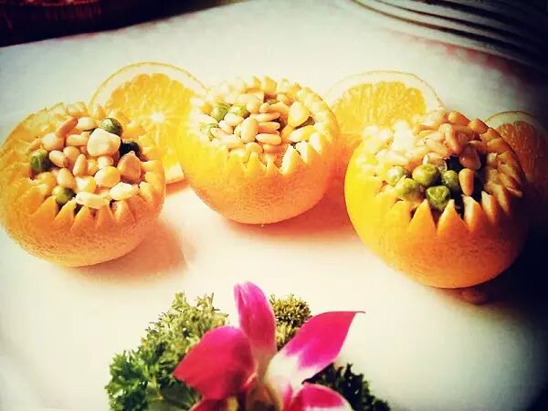 將炒熟的玉米、青豆、鬆子仁放入挖空的橙子內,再將橙肉粒放在上麵即可。