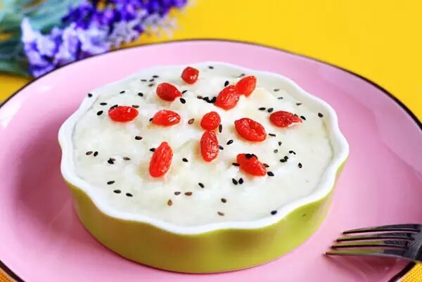 山藥100克,米粉185克,枸杞少許,牛奶100毫升,蜂蜜2大勺,果糖2大勺,芝麻1茶匙。