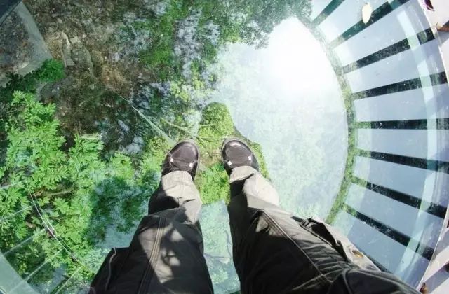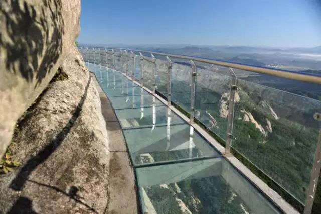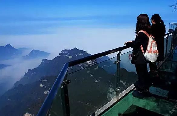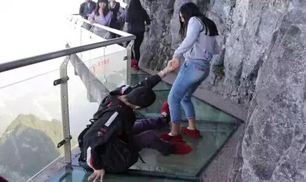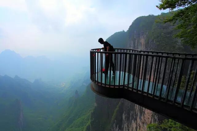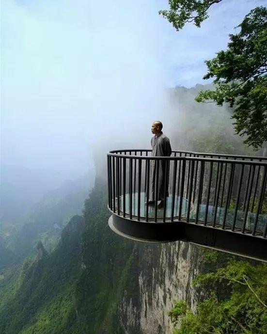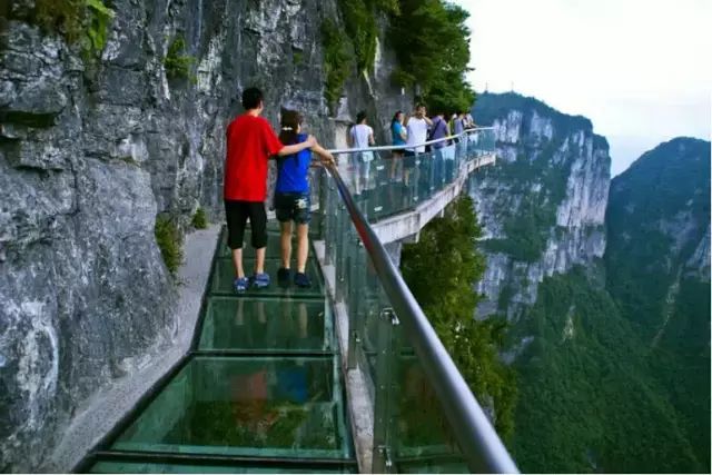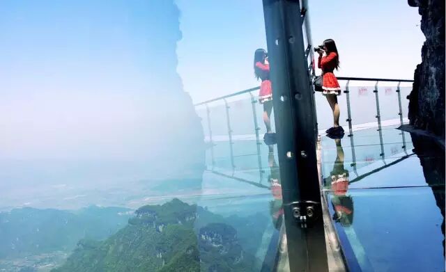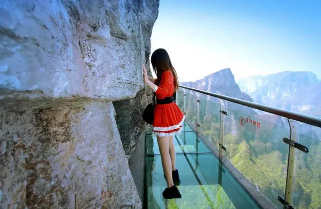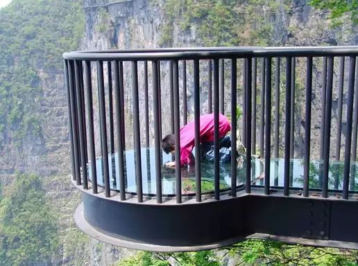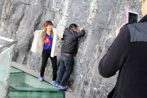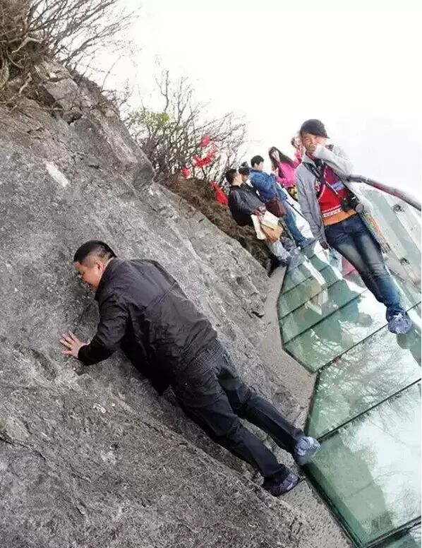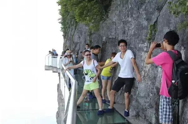 看著大家一步一步似爪牙,似魔鬼的步伐,真可謂是步步驚心啊。如果還嫌不過癮,除了棧道之外,還有個憑空伸出去5米長的玻璃站台,膽兒大的可以試試。