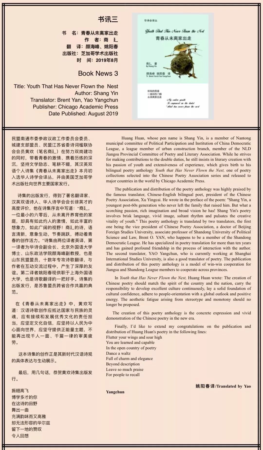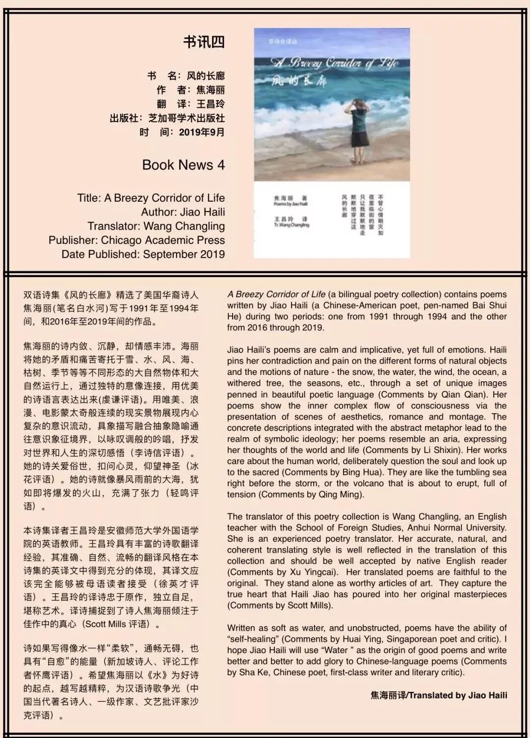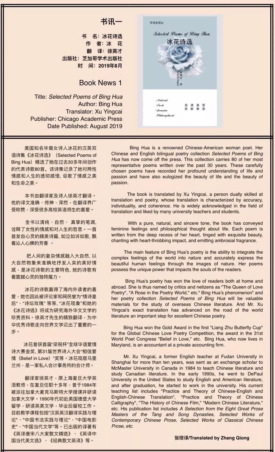 This August and September, Chinese Poetry Association has ficilitated the publication of the following four books for its members: 1. Selected Poems of Bing Hua 2. Roses by the Stream 3. Youth That Has Never Flown the Nest 4. A Breezy Corridor of Life