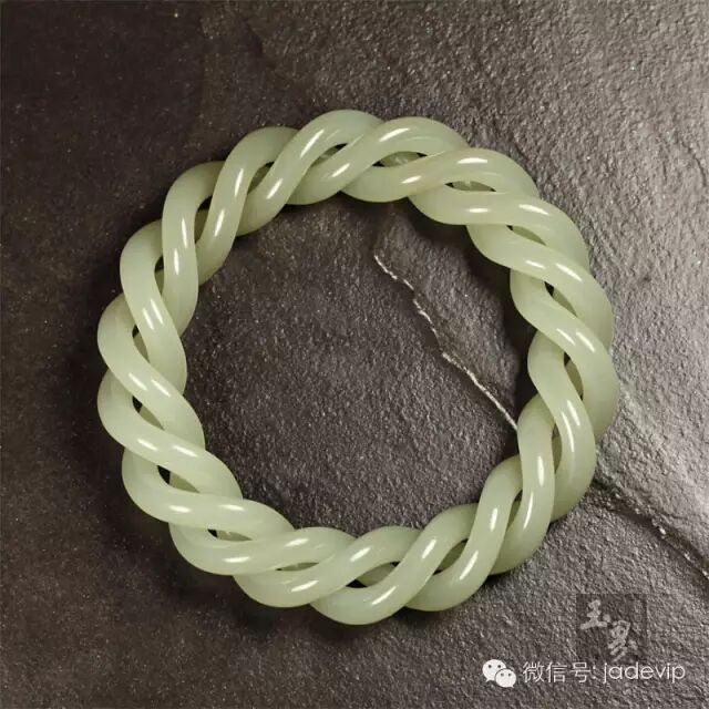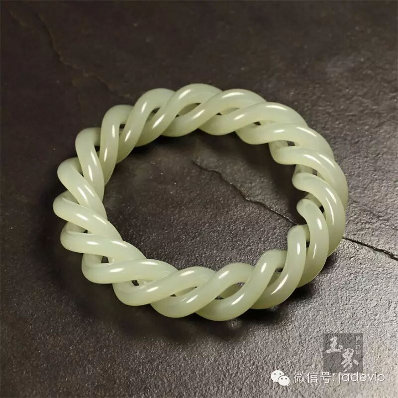 絞絲繩紋手鐲,又稱麻花鐲,也是一種較為常見的玉鐲形式。宋美齡一生最為珍愛的那對翡翠手鐲,正是絞絲繩紋式的。而我們今天接下來看到的這隻手鐲,比絞絲繩紋還更要巧妙,因為它是鏤空的。