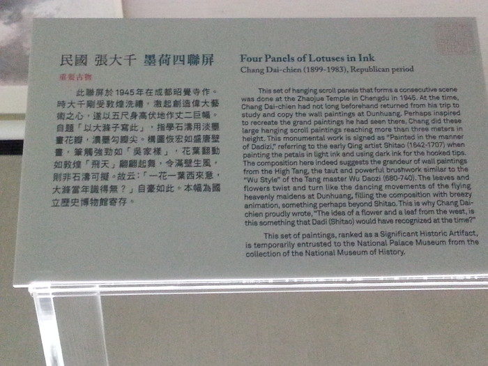 4.張大千的晚年畫作大部都在台灣,畢竟這裏是他的後半生,台北故宮有他的常年展廳。話說當年解放軍兵臨南京,張大千攜帶他的三千畫作跑到機場找到負責運送國軍細軟的陳子橋懇求搭載,飛機已經超載,軍情緊急,陳沒有軍部和老蔣的指令,悍然將三十萬兩黃金扔在跑道邊,將人畫兩大國寶運到了台灣。解放軍隨即占領機場,跑道上卻空空如也,三十萬兩黃金不翼而飛。事後陳子橋向蔣介石負荊請罪,老蔣不僅沒有裁決他,反而提升他為國軍副總司令。這段野史 耐人回味,誇老蔣愛才寬仁?而且當時領兵攻占南京的可是陳毅。我在張大千展廳裏流連往返,猛然間一段文字入眼,大致是說1949年9月,張大千攜16幅畫作趕到機場懇求當時的教育部長搭機去台,部長毅然拋棄自己的行藏和十幾兩黃金,將張載到台灣。我去! 讓導遊忽悠了。