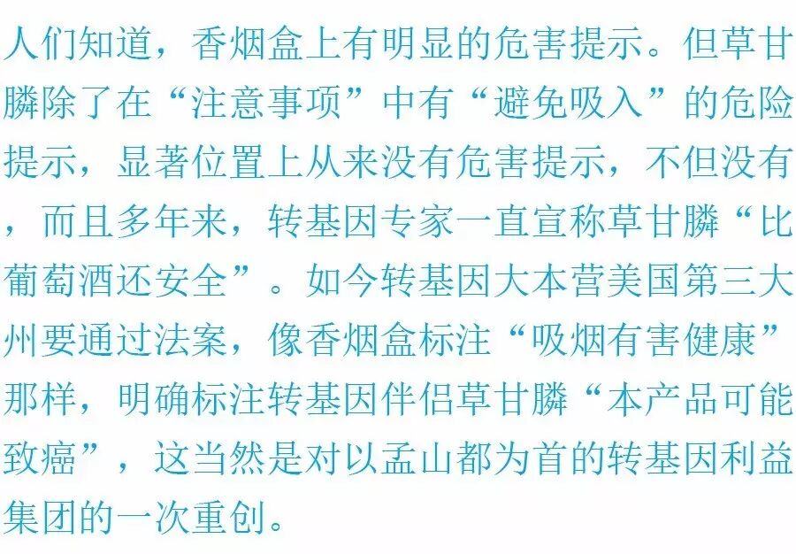 最後要說明的是,加州的65號法案,有事實依據,還有國際癌症研究機構(IARC)關於轉基因伴侶草甘膦對老鼠“確定致癌”,對人類“可能致癌”的權威機構的結論。並且美國是一個判例法國家,根據判例法製度,某一判決中的法律規則不僅適用於該案,而且往往作為一種先例而適用於以後該法院或下級法院所管轄的案件。隻要案件的基本事實相同或相似,就必須以判例所定規則處理。這就是所謂“遵循先例”(stare decisis)原則。加州65號法案正式發布之日,就是美國眾多法院依據該法案紛紛判決轉基因伴侶草甘膦“死刑”之時。今後無論什麽人,隻要再說出轉基因“沒有一例出現問題”,人們都會想到這不僅是無德、無信,而且是無恥、無賴。