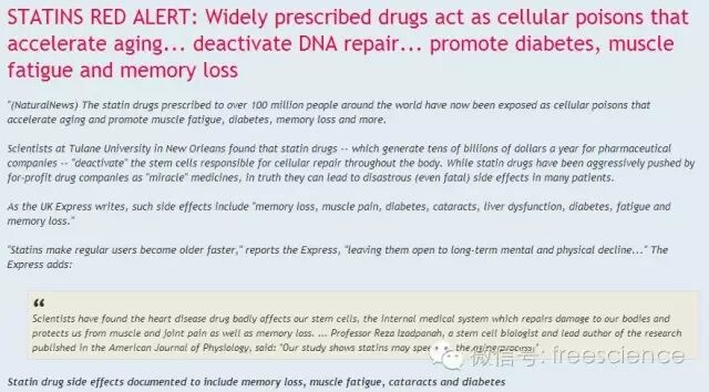 他汀類藥物已經通過營利性製藥公司“奇跡”藥品的積極推動,全球有接近2億人口使用。最近研究發現,他汀類藥物實際上可以導致災難性的(甚至是致命的)副作用。UK Express writes英國快報報道:這種副作用使許多患者,包括“記憶喪失,肌肉疼痛,糖尿病,白內障,肝功能異常,糖尿病,疲勞,記憶力減退."他汀類藥物使普通用戶會老得更快,長期服用導致精神和體力都在逐漸下降。
