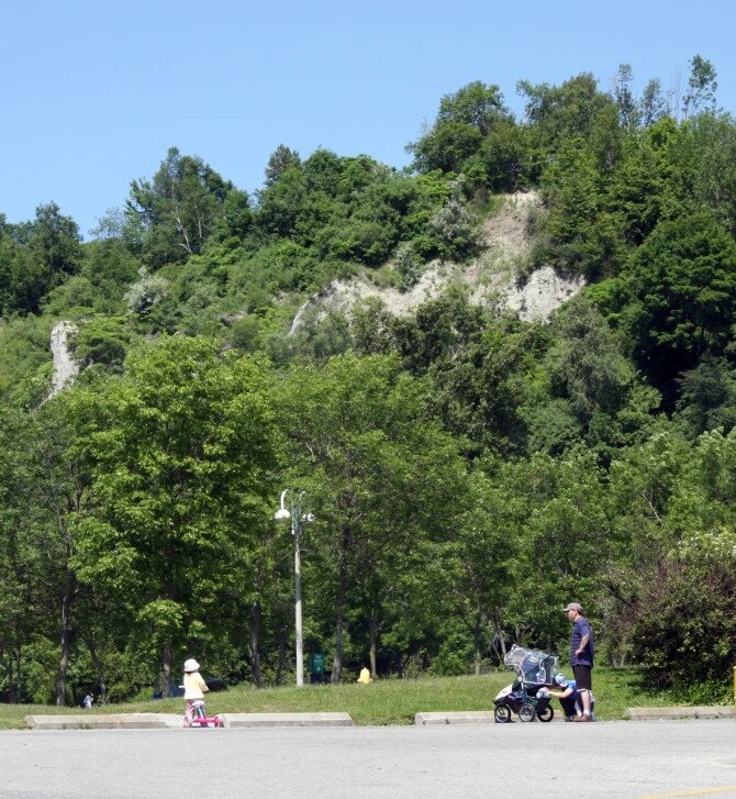 加行日記 10  多倫多市是加拿大第一大都市 ,其地位大概相當於中國的上海吧 ,它是安大略省的首府 ,其名來於境內的安大略湖 ,從我家出發向南驅車 15分鍾就到達湖邊 .湖已遙遙在望 . 湖邊有峭壁 ,所以名為 ”峭壁公園 ”,據說 ,500年前當地土著印地安人 ,用口袋戰術追捕野牛 ,讓出一條生路逼其奔向峭壁方向 ,當野牛奔到峭壁盡頭走投無路 ,便象下餃子一樣 ,紛紛墜崖而亡 .我今天看這峭壁 ,腦裏浮現的卻是 500年前匹匹野牛驚天動地翻山而下的悲壯景觀 .