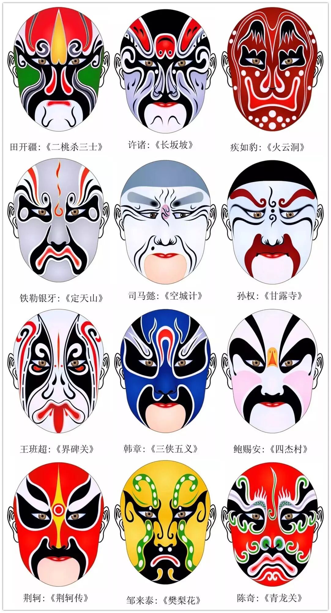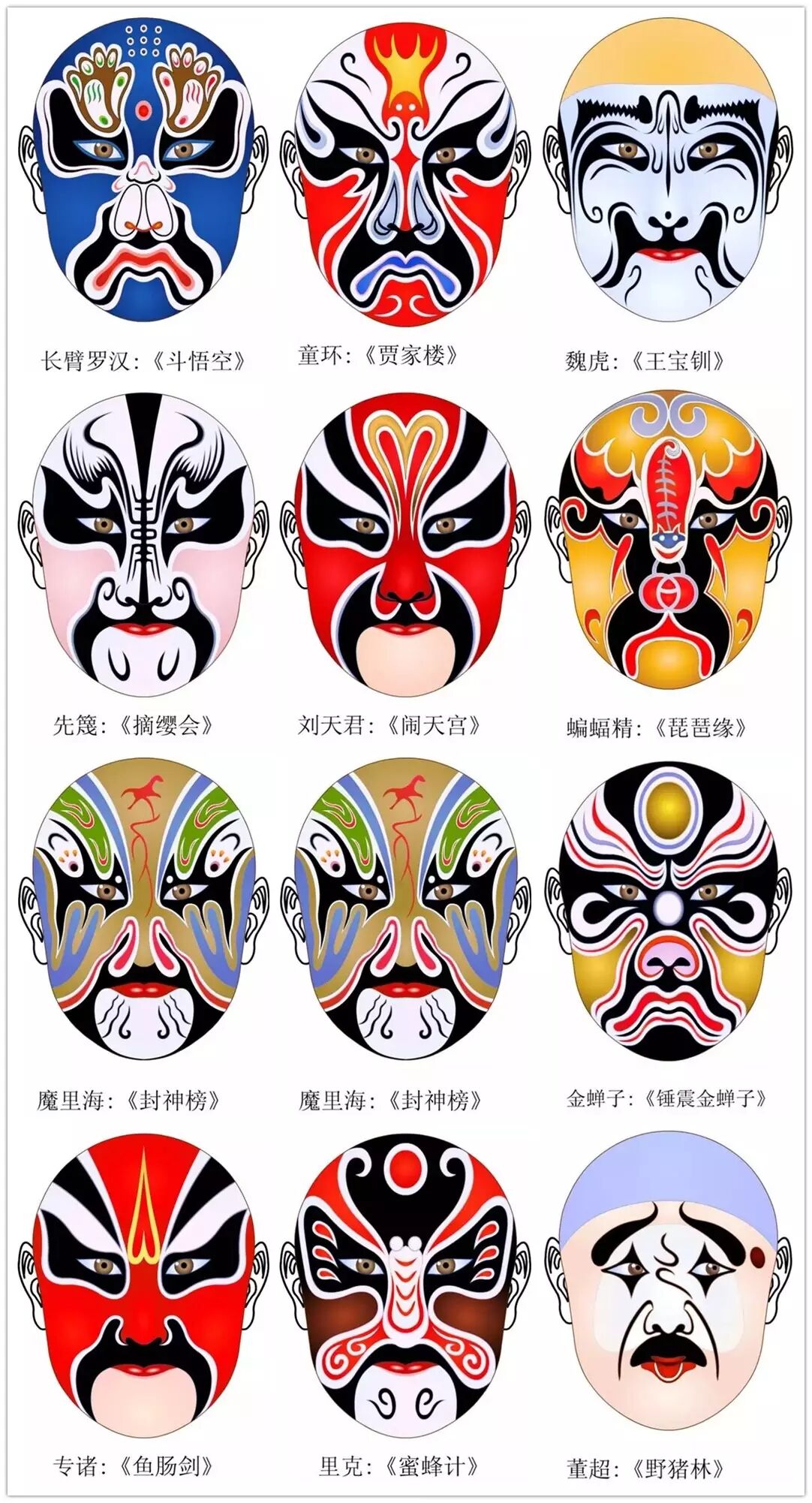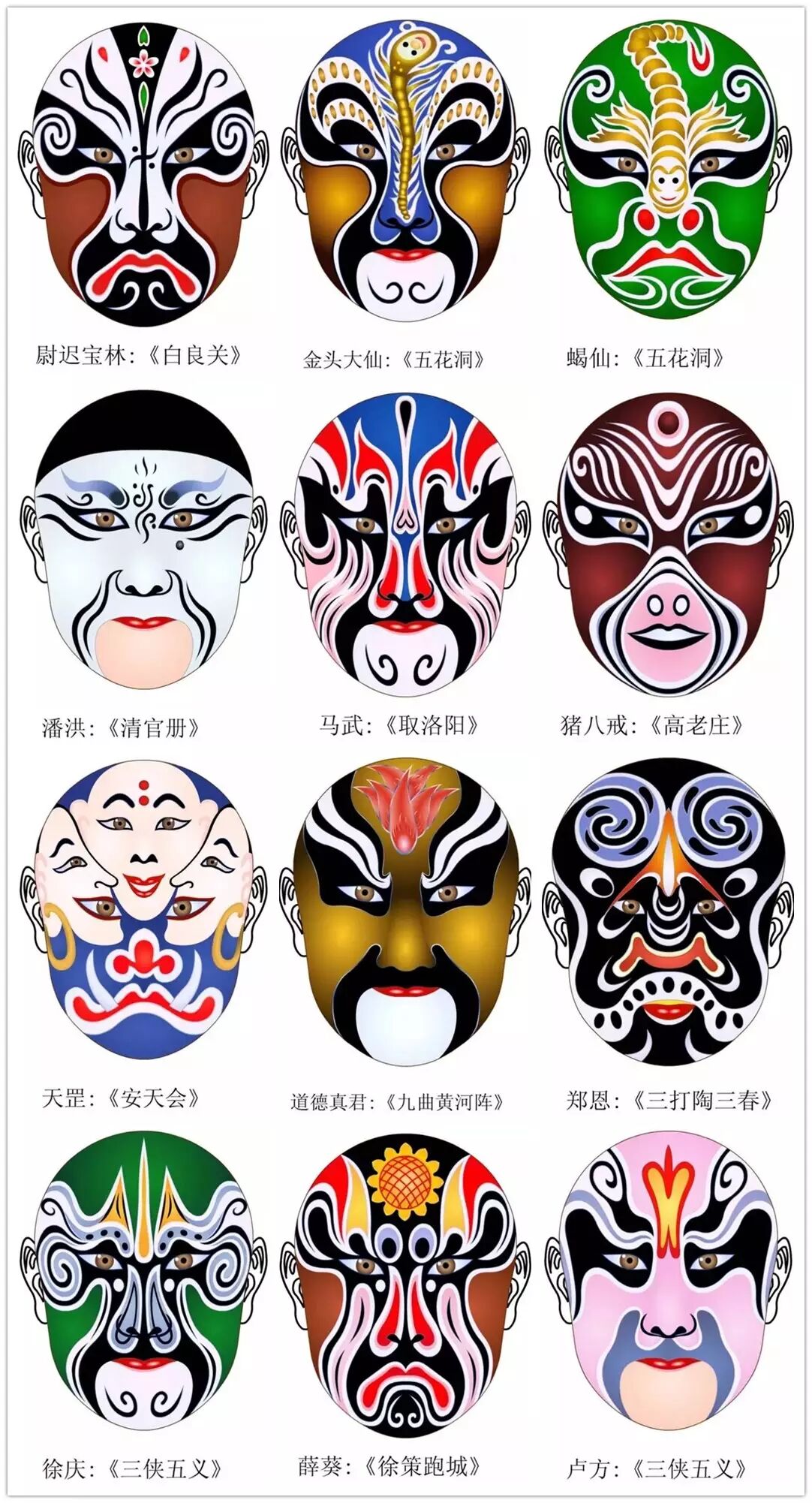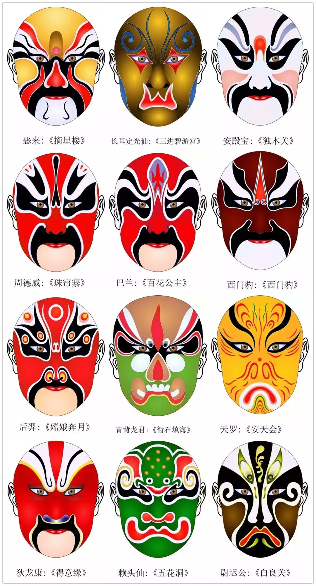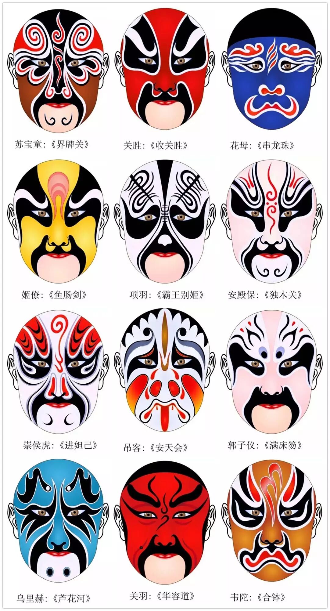 京劇臉譜是中國傳統戲曲臉譜大係中的重要分支,既有臉譜的通性,又有其本身的特點。從戲劇角度講,它是性格化的;從美術角度講,它則是圖案式的。它的譜式圖案,按所扮演人物的麵容、性格、品質、年齡取意,分為揉、勾、抹、破四大類型:揉臉,是用手指將顏色揉滿臉膛,加重眉目、麵紋的描畫;勾臉,是用毛筆蘸顏色勾眉目、麵紋、填充臉膛(這是今日京劇臉譜的主要譜式);抹臉,是用毛筆蘸水和白粉,把臉的全部或局部塗抹成白色;破臉,是指麵紋、圖形左右不對稱,亦稱歪臉。臉譜研究專家劉曾複說:揉是像真性臉譜;勾是指事性臉譜;抹是飾偽性臉譜;破是砭意性臉譜。