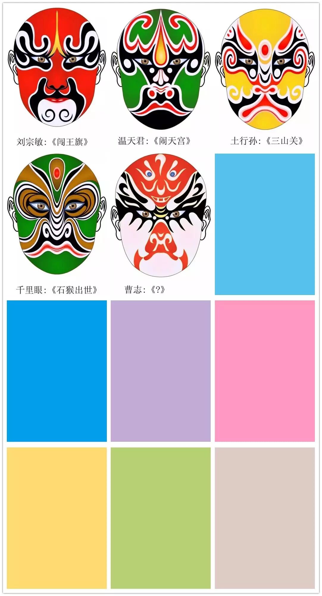 臉譜常用的顏色,有紅、白、黑、綠、藍、黃、紫和金、銀等。一般按人物的品格、性情用色:紅表示忠義、勇武;水白表示奸詐、多謀;油白表示狂妄驕縱或剛愎自用;黑表示剛毅、耿直或粗莽而誠摯,又表示鐵麵無私、公正剛直;綠表示粗豪、暴躁;藍表示豪爽、驍勇、桀驁不馴;黃表示暴烈、驃悍或工於心計、有凝煉之氣;紫表示穩健、持重、靜穆;金、銀表示嚴、威武,為神佛人物。此外,還有老紅、粉紅、瓦灰、蟹青等色。
