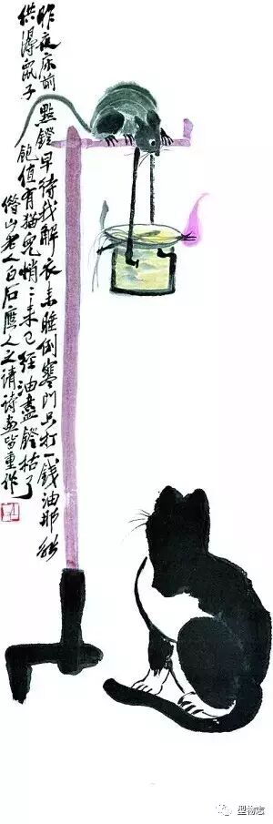 畫麵裏,老鼠偷油,貓坐在地上守候觀望。最有趣的是他的題字:“昨夜床前點燈早,待我解衣來睡倒。寒門隻打一錢油,哪能供得鼠子飽。值有貓兒悄悄來,已經油盡燈枯了。”