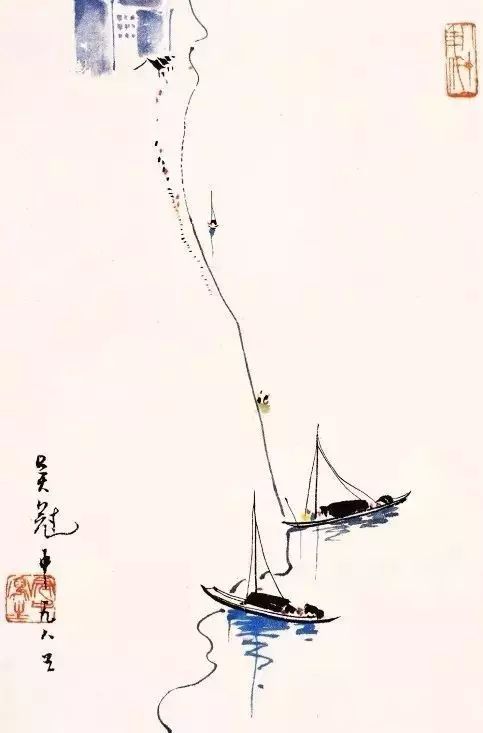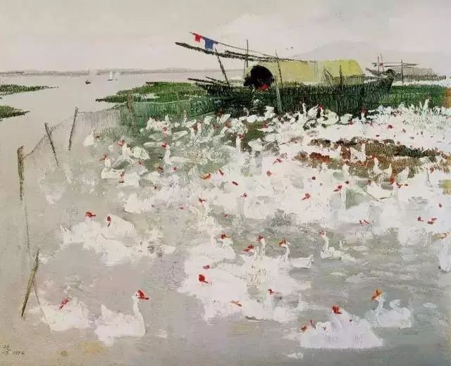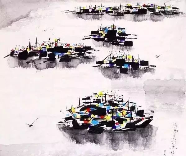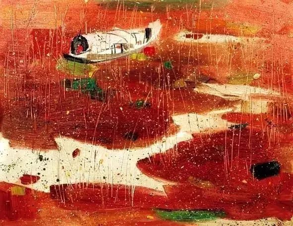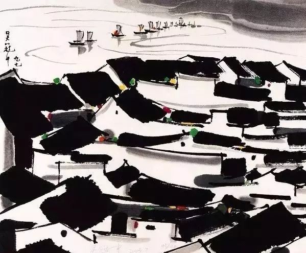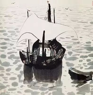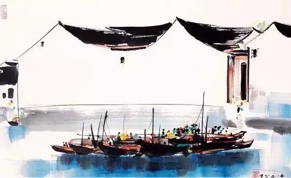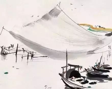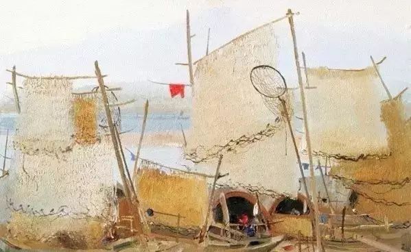 吳冠中愛畫船,主要由於視覺美的吸引,孤舟、舟群、帆起帆落、繩索交錯、桅杆倒臥起伏、線纏繞著麵、手忙腳亂的漁民。色彩的斑駁,都給予畫家盡情揮寫的大好時機。