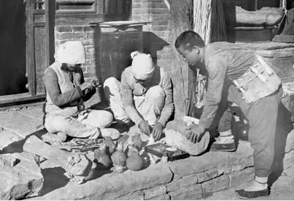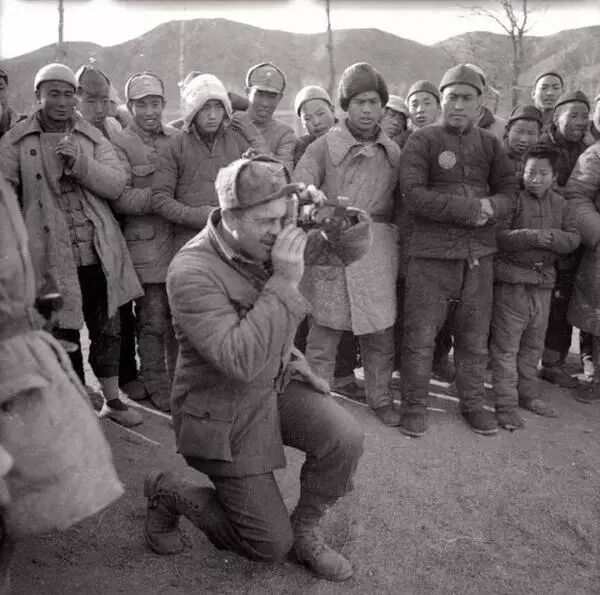 1944年,晉察冀邊區的“土八路”興致勃勃觀看美軍觀察組杜木克少校拍照。