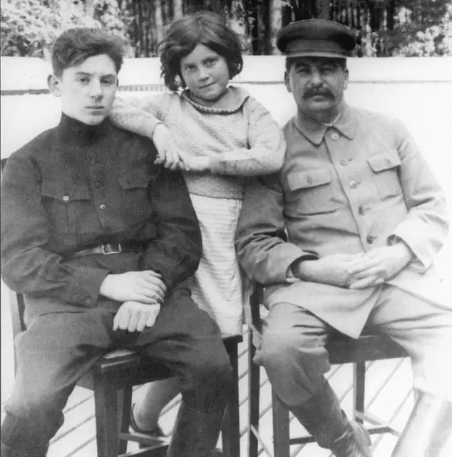 斯大林與他的兩個孩子:瓦西裏和斯韋特蘭娜,時間是1934年