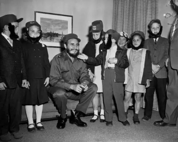 菲德爾·卡斯特羅和孩子們在一起,孩子們都戴著假胡子,這張照片大約拍攝於1969年或1970年