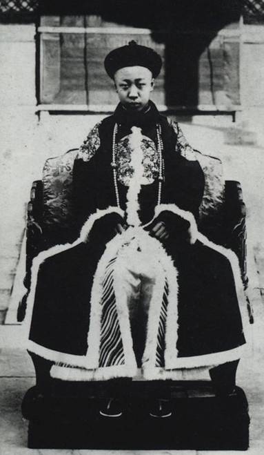 “末代皇帝”溥儀身穿龍袍,坐在紫禁城乾清宮的龍椅上