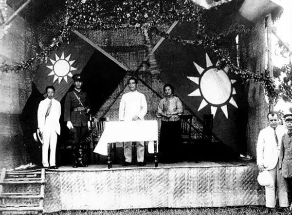 圖為孫中山、宋慶齡、廖仲愷(左一)、蔣介石(左二)在黃埔軍校開學典禮的主席台上。
