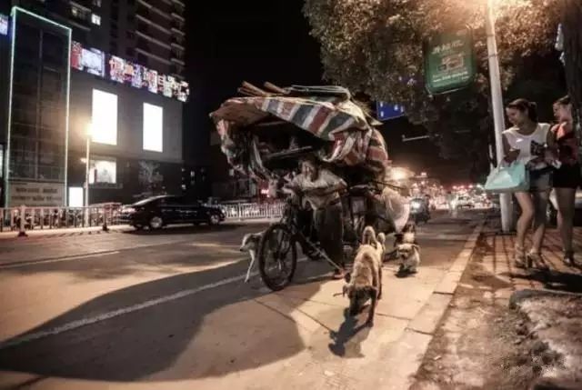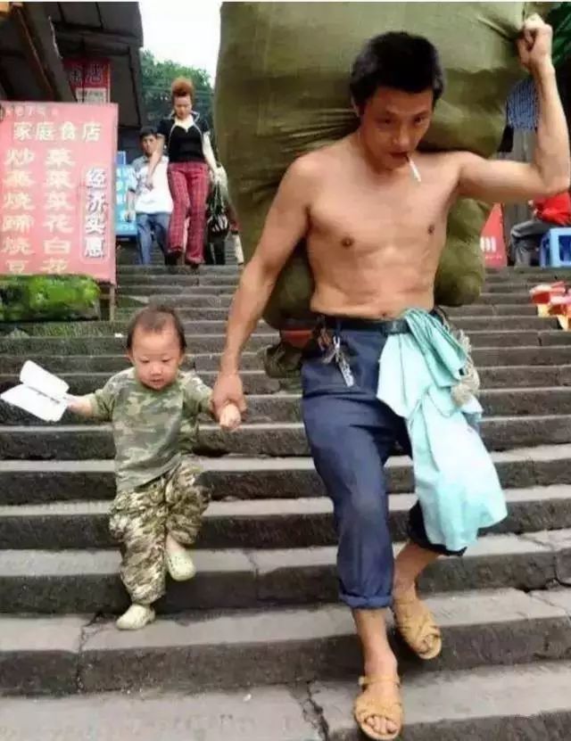 一位父親肩上扛著200多斤的貨物,一隻手緊緊抓著貨物的一個角,另一隻手牽著小小的兒子從梯坎走下,嘴上還叼著一支煙。“嘴上叼的是自己,肩上扛的是家庭,手上牽的是未來。”