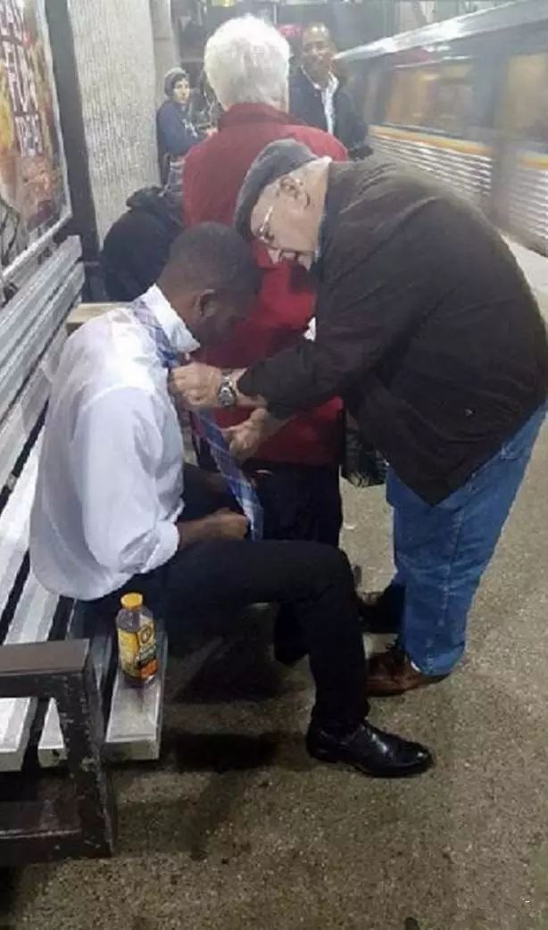 一位老人手把手教年輕人如何打好領帶