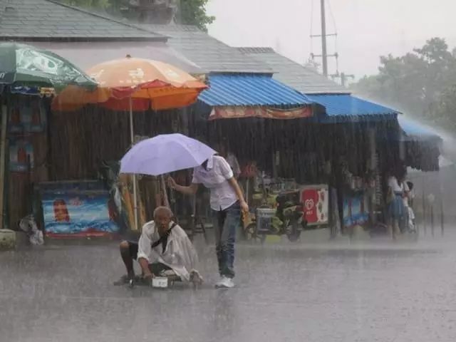 因腿部殘疾,爺爺隻能靠乞討為生,大雨磅礴來不及避雨,隻能望雨興歎。突然,一個姑娘出現了,為他撐起了傘。