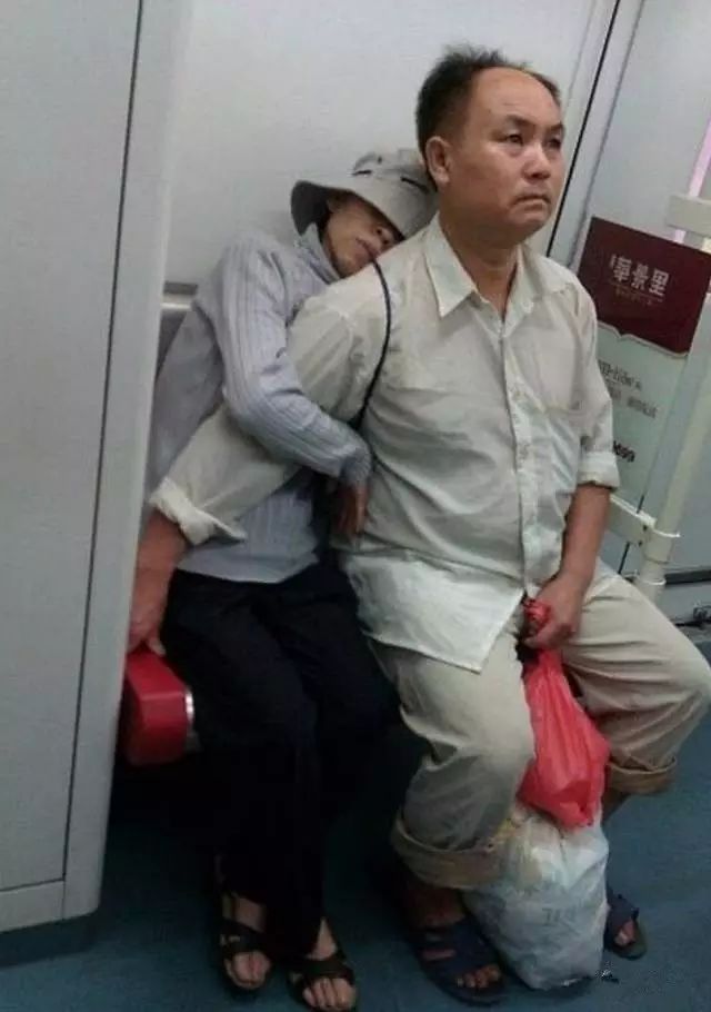 上海地鐵上,疲乏的老父親在兒子懷中安穩地睡著了。看多了父母摟著孩子的,但看到摟著老父親睡覺的,還是第一次。