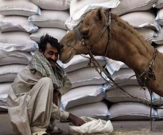 巴基斯坦,一頭駱駝親吻給自己喂食的主人。