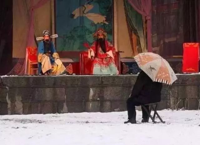 下雪了,戲台前隻有老爺爺一個人在撐傘看戲。傳承與發揚,路漫漫而修遠。
