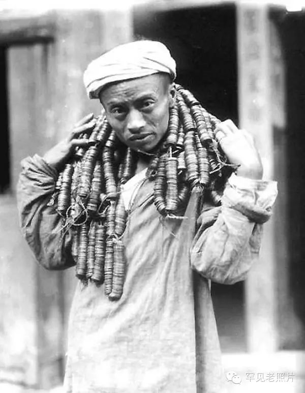 1917年,四川,頸脖上掛13500個銅板的路人。銅錢貶值,物價上漲,購物時不得不背上幾十斤重的銅錢串。