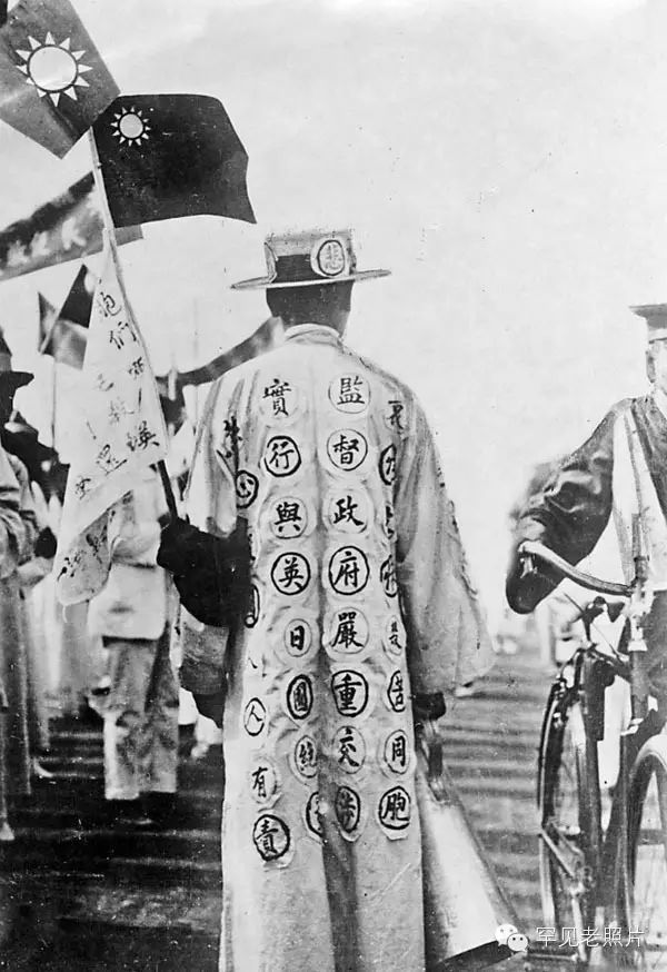1927年,武漢,一個人穿著與英日絕交口號的服裝參加反帝遊行示威。
