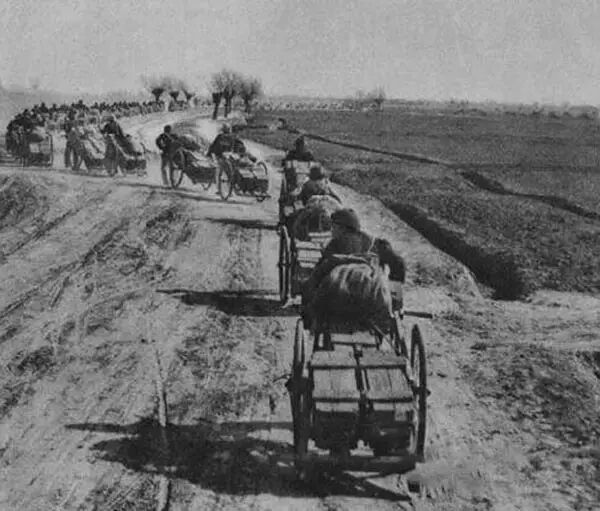 1948年11月,淮海戰役中,中原人民支援拖運解放軍彈藥、物品的架子車隊 。