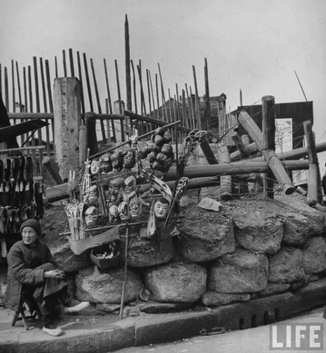 重慶,廢墟前賣麵具、木刀等兒童玩具的小販。卡爾·邁登斯/攝,大約拍攝於1940-1941年。