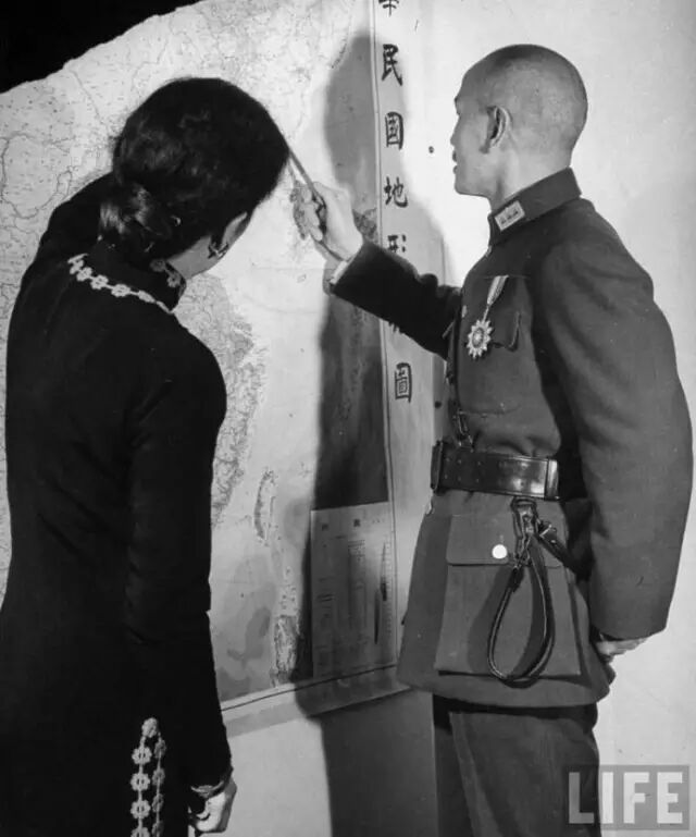 重慶,蔣介石與宋美齡觀看地圖,研究抗戰形勢。卡爾·邁登斯/攝,大約拍攝於1940-1941年。