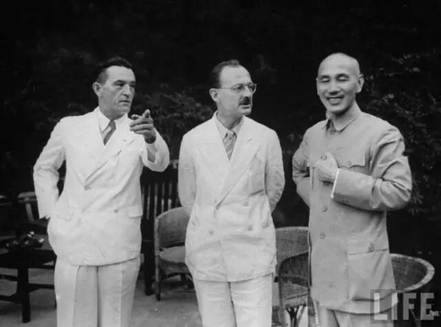 重慶,蔣介石與陳納德(左)、美國漢學家也是蔣的政治顧問歐文·拉鐵摩爾(中)。卡爾·邁登斯/攝,大約拍攝於1940-1941年。