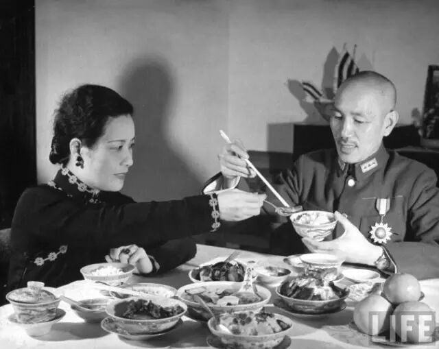 重慶,蔣介石與宋美齡共進晚餐,夫妻之間顯得很恩愛。卡爾·邁登斯/攝,大約拍攝於1940-1941年。