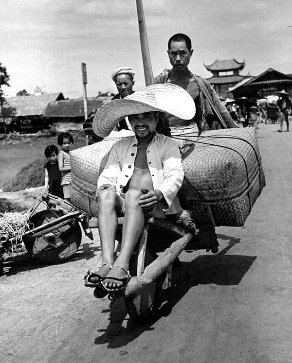 1941年,四川簡陽縣龍泉驛鎮,一位獨輪車夫攬到一筆生意,載客送貨。卡爾·邁登斯/攝。