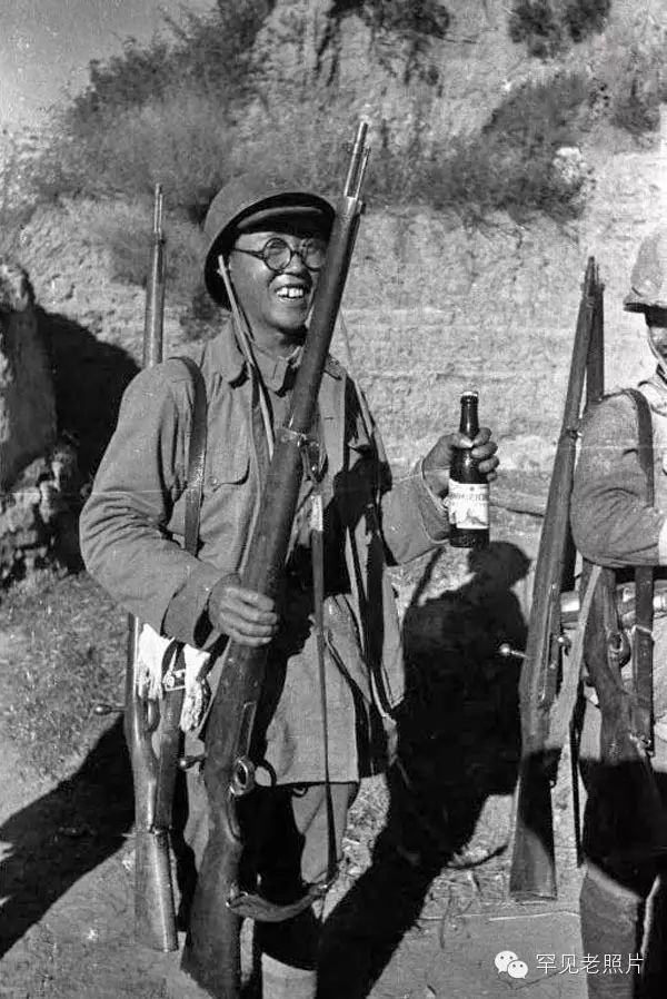 1944年,晉綏邊區,經過一夜激戰,一位八路軍戰士繳獲來的日本戰利品步槍,頭盔,和幾瓶葡萄酒。