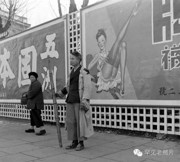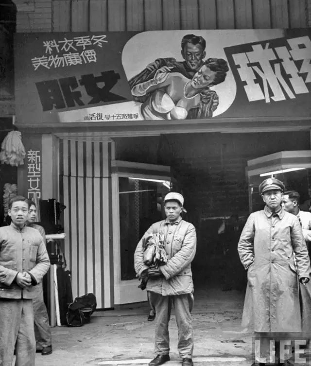 1948年,挑擔工站在絲襪美女前,讓攝影師給拍一張。看來,那時大上海人們思想已經很開放了。