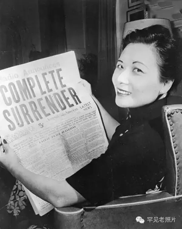 1945年8月15日,宋美齡在看報紙,頭條是日本投降。