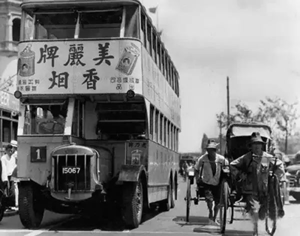 1945年2月,上海,雙層巴士與黃包車仍是這城市不尋常風景。