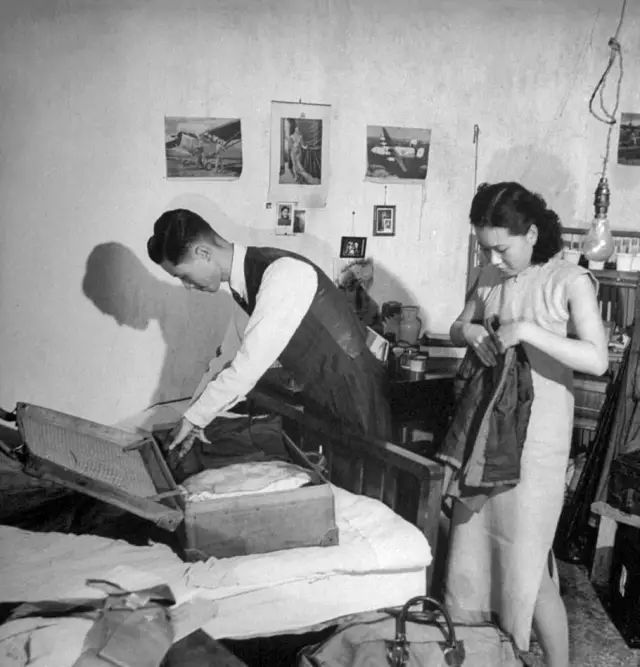 1945年9月,重慶,政府公務人員譚泉宇與妻子收拾行李準備搬家。傑克·威爾克斯/攝。
