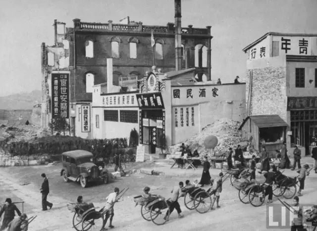 重慶,在城市的廢墟中繼續營業的國民酒家。卡爾·邁登斯/攝,大約拍攝於1940-1941年。