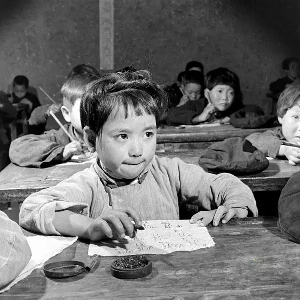 1947年5月,陝西臨潼縣,二年級1班的孩子在聽老師講課。