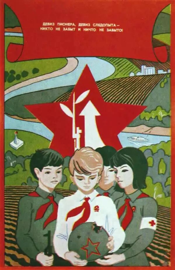 1979年宣傳畫,畫中文字內容是“少先隊員的口號、少年追蹤者的口號:無人被遺忘、無事被遺忘”。