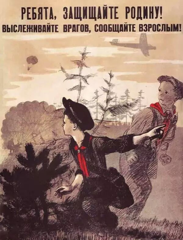 1941年宣傳畫,畫中文字內容是“孩子們保家衛國,監視敵人,報告父母”。