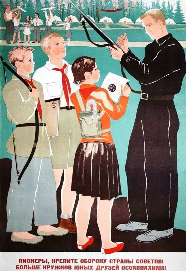 1934年宣傳畫,畫中文字內容是“少先隊員們都來鞏固蘇聯國防,多參加國防和航空化學建設促進會少年小組”。