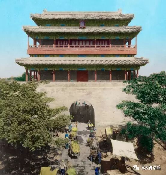 我小的時候,老北京還古貎猶存,雖然年久失修,可永定門城門樓還在(我無論如何也想不起甕城和箭樓的模樣了),兩側的城牆也還在。城門樓三層飛簷,淩空翹起,樓頂綠琉璃瓦剪邊,畫棟雕梁,油漆剝落。它是那樣高大,像一個莊嚴的老爺子注視著在它周圍生活著的人們,以致我後來在想起它的時候,都要抬起頭來。城門洞裏兩扇大門永遠貼著牆,好像從來也沒有關上過。夏天的時候,門洞裏總是有許多人或站或坐,享受著颼颼的涼風。