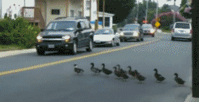 一群小鴨子過馬路,路過的司機停下車來,耐心等著它們先行。