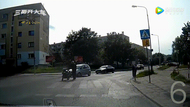 車來車往的馬路上,一位老人被困在路邊。騎摩托車的小夥子停下車來,護送老人走過。道路兩邊的車輛都停了下來,默默等待…