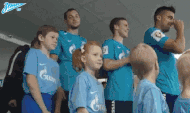 球賽開始前,球員調皮地捉弄前麵的小姑娘。