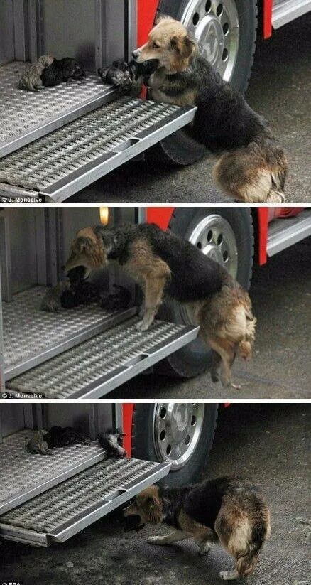 智利一戶人家發生大火,在消防員奮力救火的同時,一隻狗媽媽,一次又一次的衝進熊熊烈火,救出了隻有10天大的狗寶寶。
