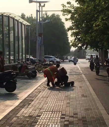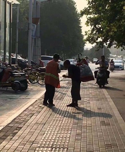 環衛阿姨把自己的雞蛋早餐,讓給盲人乞討者吃。並且剝好皮,喂到他嘴裏,盲人跪地感謝。