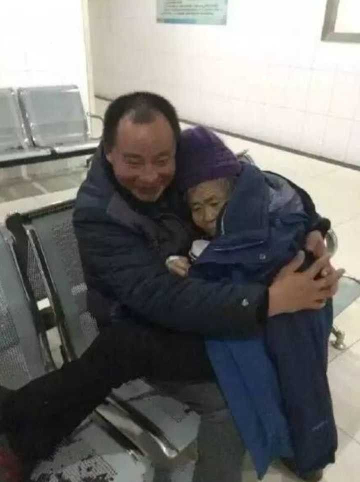醫院裏,一對母子在等候做CT。天氣又陰又冷,兒子擔心母親受涼,把母親緊緊抱在懷裏。